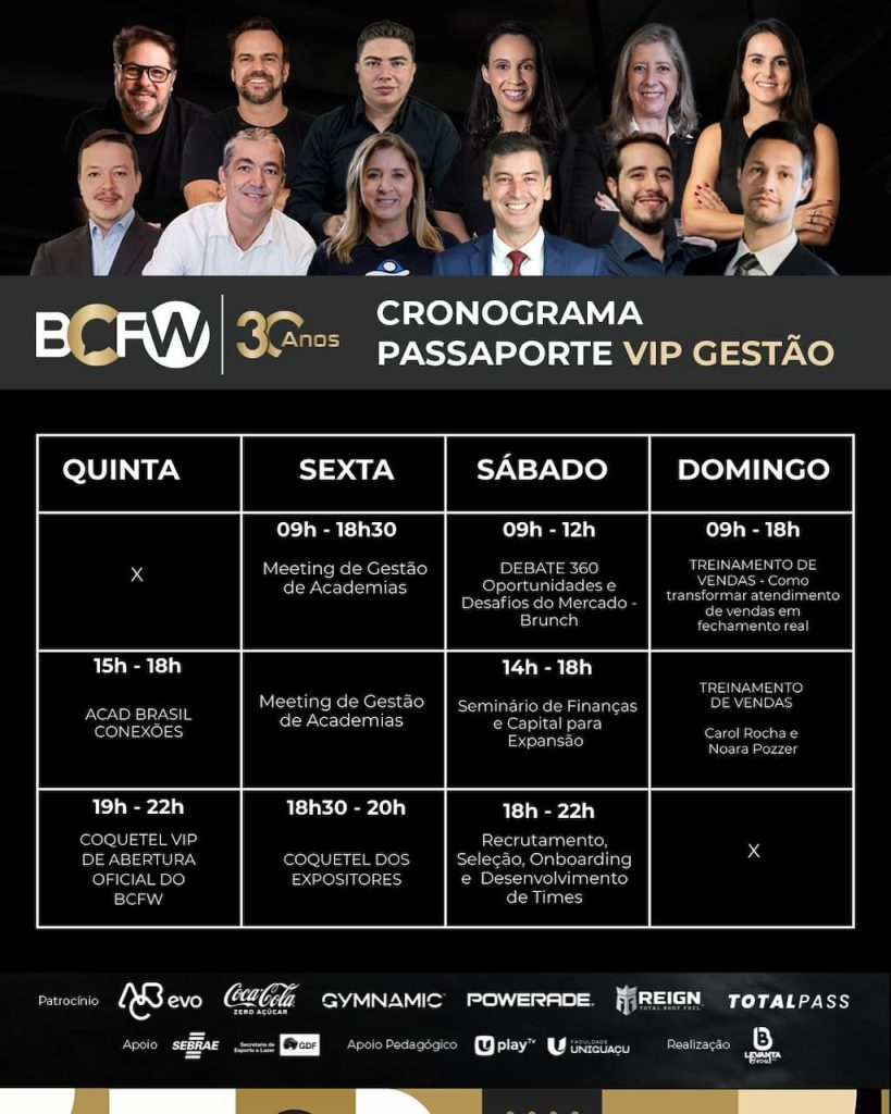 Com patrocínio de ABC EVO, Total Pass, Gymnamic, Coca-Cola Zero Açúcar, Powerade e Reign, apoio do Sebrae e da Secretaria de Esportes do GDF, além de apoio pedagógico da Uniguaçu, o BCFW 30 anos celebra três décadas de inovação, tradição e movimento que transforma vidas.