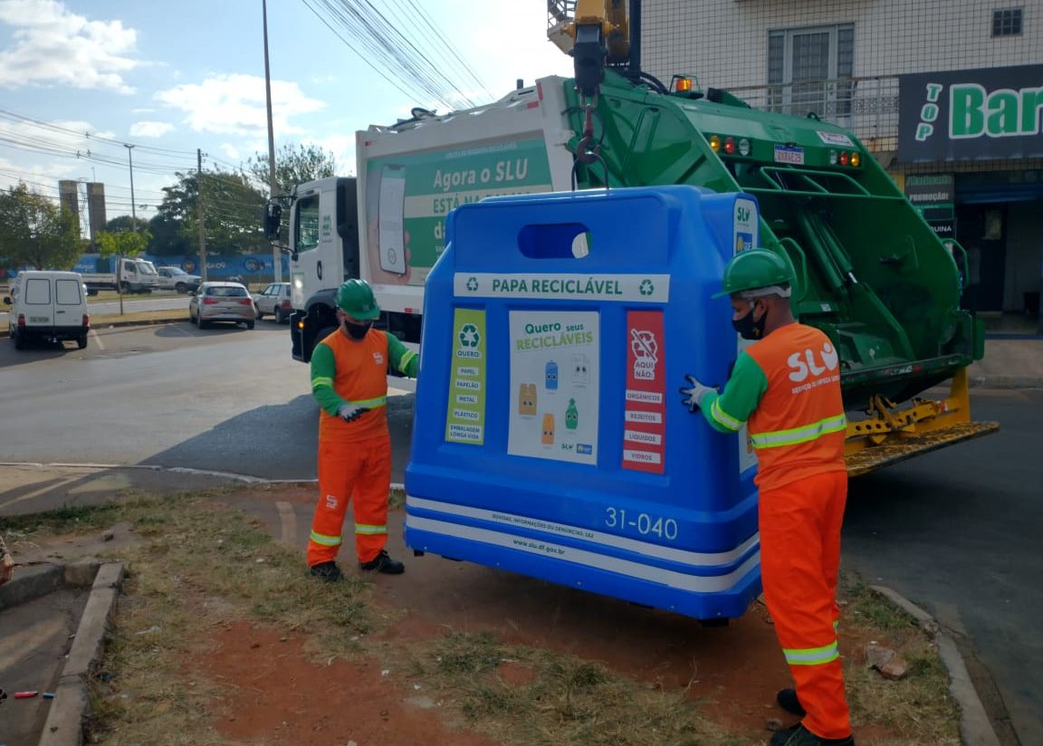No contêiner azul a população pode descartar qualquer tipo de material seco, como papel, papelão, metal e plásticos. O SLU já instalou, na primeira etapa, 102 papa-recicláveis em 11 regiões administrativas.