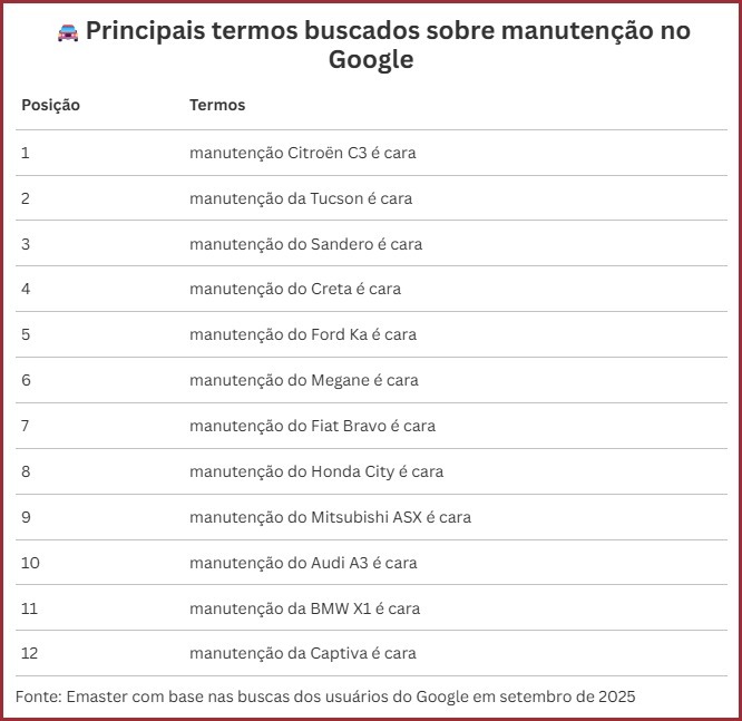 Nesse contexto, os 12 modelos mais pesquisados em 2025 incluem desde veículos compactos até SUVs de médio porte, demonstrando que a dúvida sobre o custo de manutenção não está restrita a uma faixa de preço específica.