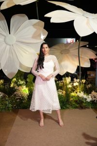 Entre os destaques estão os bordados manuais exclusivos, aplicações florais tridimensionais e o uso de tecidos nobres como zibeline, tule, crepe e seda — elementos que revelam o cuidado artesanal e a identidade singular da marca.