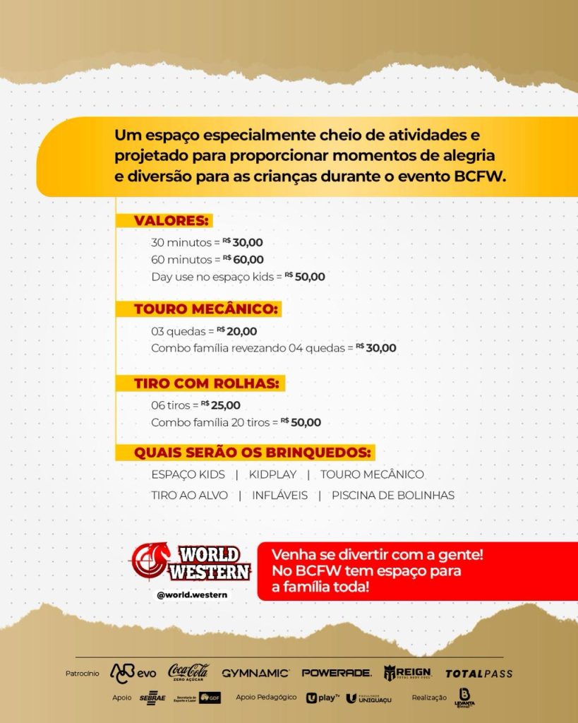Além da programação voltada ao universo do fitness, saúde e bem-estar, o evento também preparou uma homenagem especial para os pequenos. No Dia das Crianças, 12 de outubro, o BCFW contará com um espaço totalmente dedicado à diversão da garotada, com atividades como KidPlay, piscina de bolinhas, touro mecânico, tiro ao alvo e infláveis, garantindo alegria, movimento e lazer para toda a família. Mais do que celebrar a data, a iniciativa reforça o compromisso do BCFW em estimular hábitos saudáveis e o bem-estar desde a infância, em um ambiente acolhedor, festivo e cheio de energia.