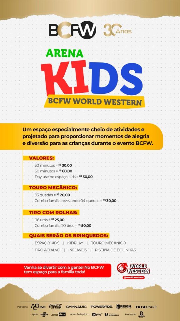 Além da programação voltada ao universo do fitness, saúde e bem-estar, o evento também preparou uma homenagem especial para os pequenos. No Dia das Crianças, 12 de outubro, o BCFW contará com um espaço totalmente dedicado à diversão da garotada, com atividades como KidPlay, piscina de bolinhas, touro mecânico, tiro ao alvo e infláveis, garantindo alegria, movimento e lazer para toda a família. Mais do que celebrar a data, a iniciativa reforça o compromisso do BCFW em estimular hábitos saudáveis e o bem-estar desde a infância, em um ambiente acolhedor, festivo e cheio de energia.
