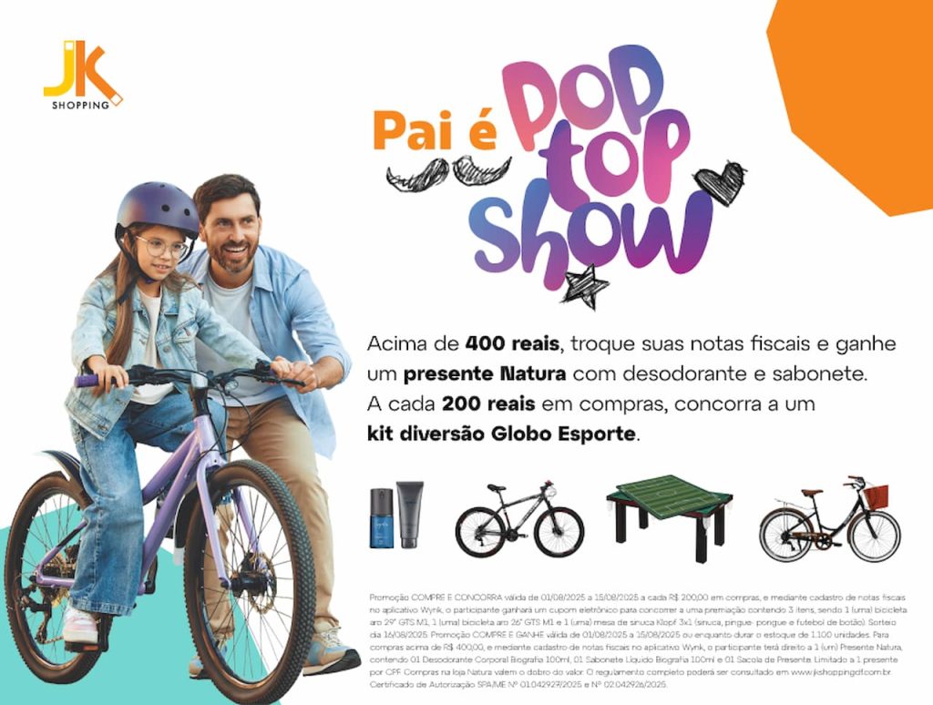 Com sorteio de bikes, mesa de sinuca e brinde Natura, JK Shopping celebra o Dia dos Pais com experiências que unem presente, afeto e diversão