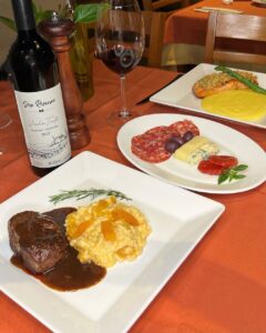 O menu começa com uma entrada clássica: bruschetta tradicional e um antipasto singolo, uma mini tábua de frios composta por dois tipos de queijos, salaminho, azeitonas e tomate seco.