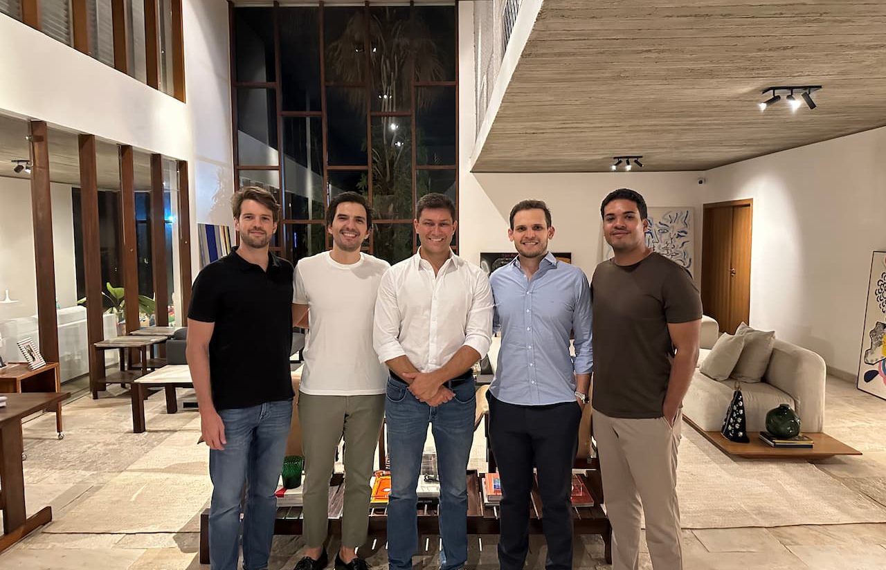 Foto: Felipe Maldonado, idealizador do Fazenda da Matta, ao centro, e Rodrigo Tomasi, Christian Frota Pedro Henrique Machado e Guilherme Siqueira Campos, sócios da DVLP, durante o evento intimista em Brasília que marcou a celebração da parceria estratégica entre as empresas. Créditos: Divulgação.