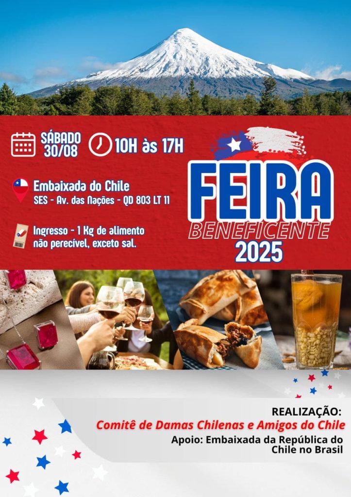 No último sábado do mês de agosto, 30, a Embaixada do Chile em Brasília abrirá suas portas ao público para a edição 2025 da Feira Beneficente do Chile, promovida pelo Comitê de Damas Chilenas e Amigos do Chile, com apoio da Embaixada do Chile e do Embaixador Sebastián Depolo e do cônsul Javier Foxon. O evento acontece das 10h às 17h e a entrada será mediante a doação de 1 kg de alimento não perecível.