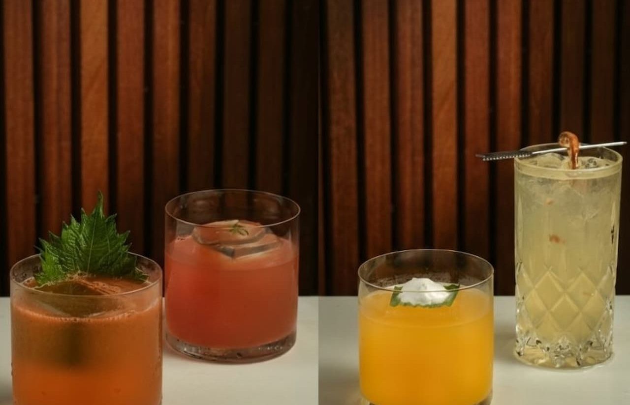 Bushido, Negroni Gurumê, Nagi e Arandu: quatro interpretações da coquetelaria autoral que traduzem a identidade do Gurumê em taça. Crédito: Matheus Ramos/Gurumê.