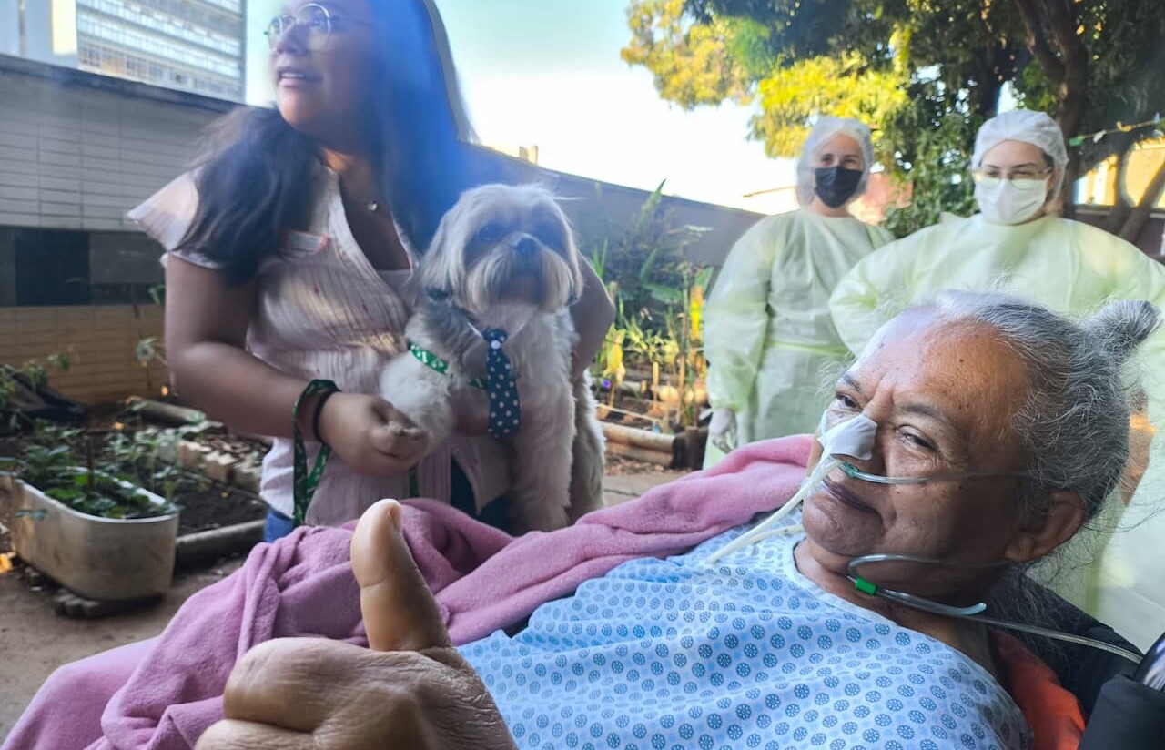 Na tarde de segunda-feira (16), o jardim do Hospital de Base foi cenário de um encontro emocionante. A paciente Maria Helena Fernandes da Silva (71 anos), internada sob os cuidados da equipe de Neurologia, recebeu uma visita para lá de especial: seus cinco netos e o fiel companheiro de quatro patas, o cãozinho Ben, da raça Shih-Tzu.