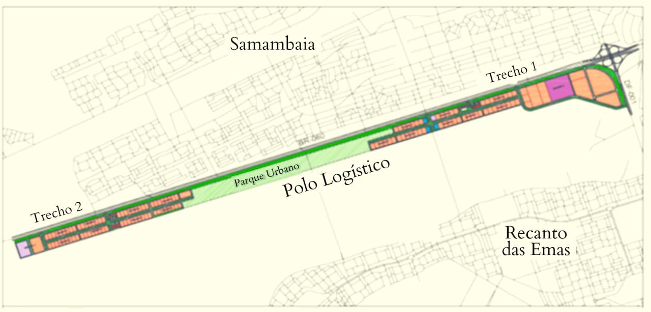 A área, de 260 hectares, fica entre o Recanto das Emas e Samambaia, na BR 060. A estimativa é que no local haja oferta adequada de comércio e serviços de apoio ao polo logístico | Imagem: Reprodução