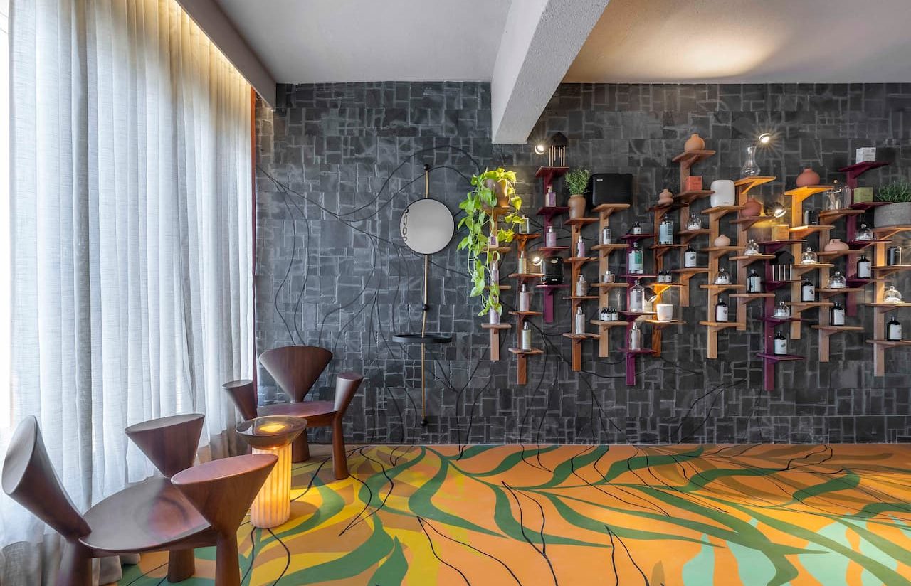 O piso pintado à mão pela artista plástica Érica Saraiva é uma obra exclusiva que evoca as ervas do alguidar, intensificando a atmosfera imersiva. A materialidade do espaço carrega a mesma força poética: o revestimento natural Pizarra Croco, da Ikê Pedras, com textura que remete à pele, dialoga com as cores e efeitos aplicados pela Tintas Coral, criando superfícies táteis e orgânicas.