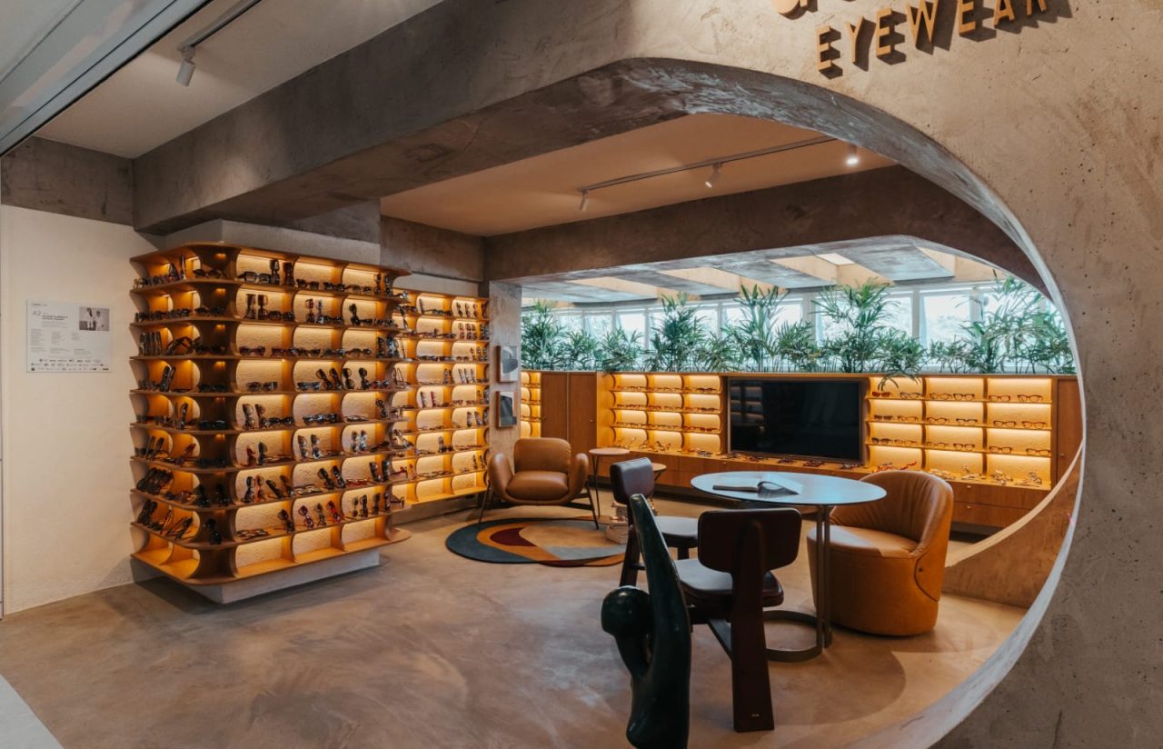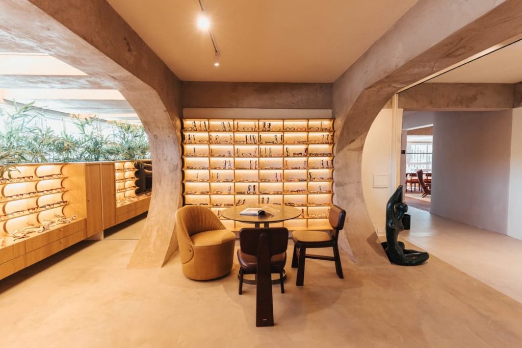 A composição combina acabamentos rústicos — como parede em chapisco e concreto aparente — a jardins internos assinados pelo Depieri Paisagismo e a um tapete orgânico e colorido da Punto e Filo por Gallery Tapetes. O mobiliário em couro dialoga com peças de design brasileiro premiadas, como a Poltrona Barista, de Fabrício Ronca, vencedora do iF Design Award 2025, e a Cadeira Estandarte, de Samuca Gerber, ambas da Salva Mobiliário. Obras de arte de Moacyr Travaglia e Sonia Ebling ampliam o caráter cultural do espaço, que também abriga óculos autorais do Gustavo Eyewear, reforçando o olhar como símbolo de perspectiva e conexão.
