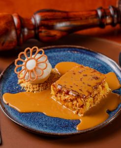 bolinho de milho verde com doce de leite, sorvete de tapioca e castanha de caju