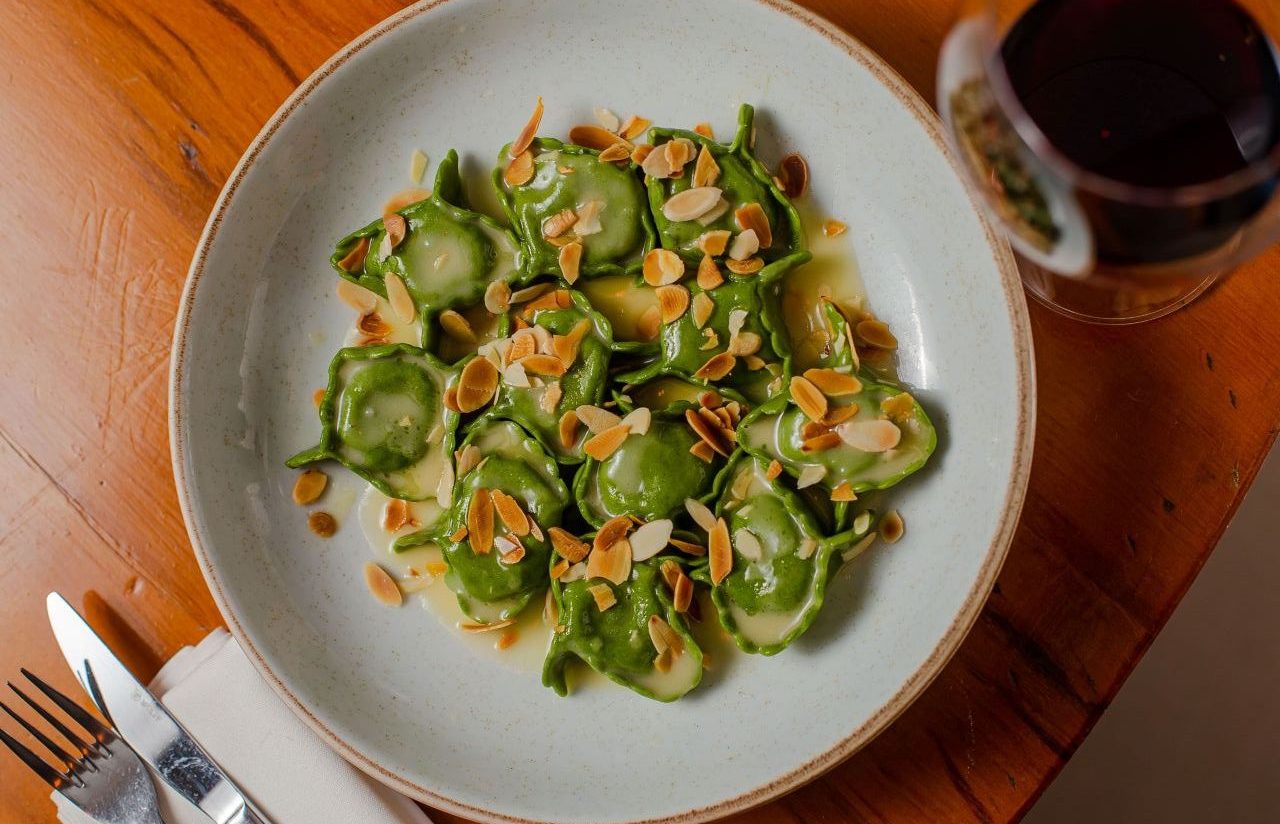 Foto: Raviolini de Brie e Pêra (vegetariano) tem massa verde fresca, salteada na manteiga com mel trufado e amêndoas laminadas - Aroma. Créditos: Davi Fernandes.