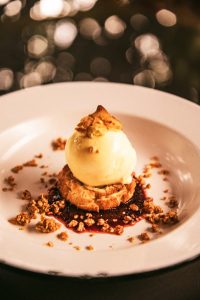 Para finalizar, duas opções clássicas: o Pudim de Chocolate com calda de maracujá e os Profiteroles recheados com sorvete de creme e doce de leite.