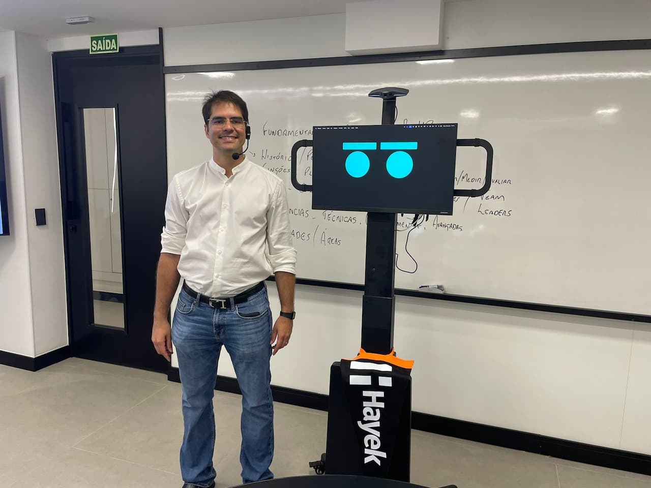 Imagine ter aulas com professores do outro lado do mundo, como se eles estivessem caminhando ao seu lado na sala de aula. Na Hayek Global College, por meio de inovação e tecnologia, o professor, localizado na Austrália, nos Estados Unidos ou em qualquer outro país, pode “andar” virtualmente pelo espaço da faculdade internacional em Brasília. Essa experiência é possível com o Haybot, robô criado pela própria instituição para conectar alunos a professores internacionais e tornar as aulas mais dinâmicas e envolventes.