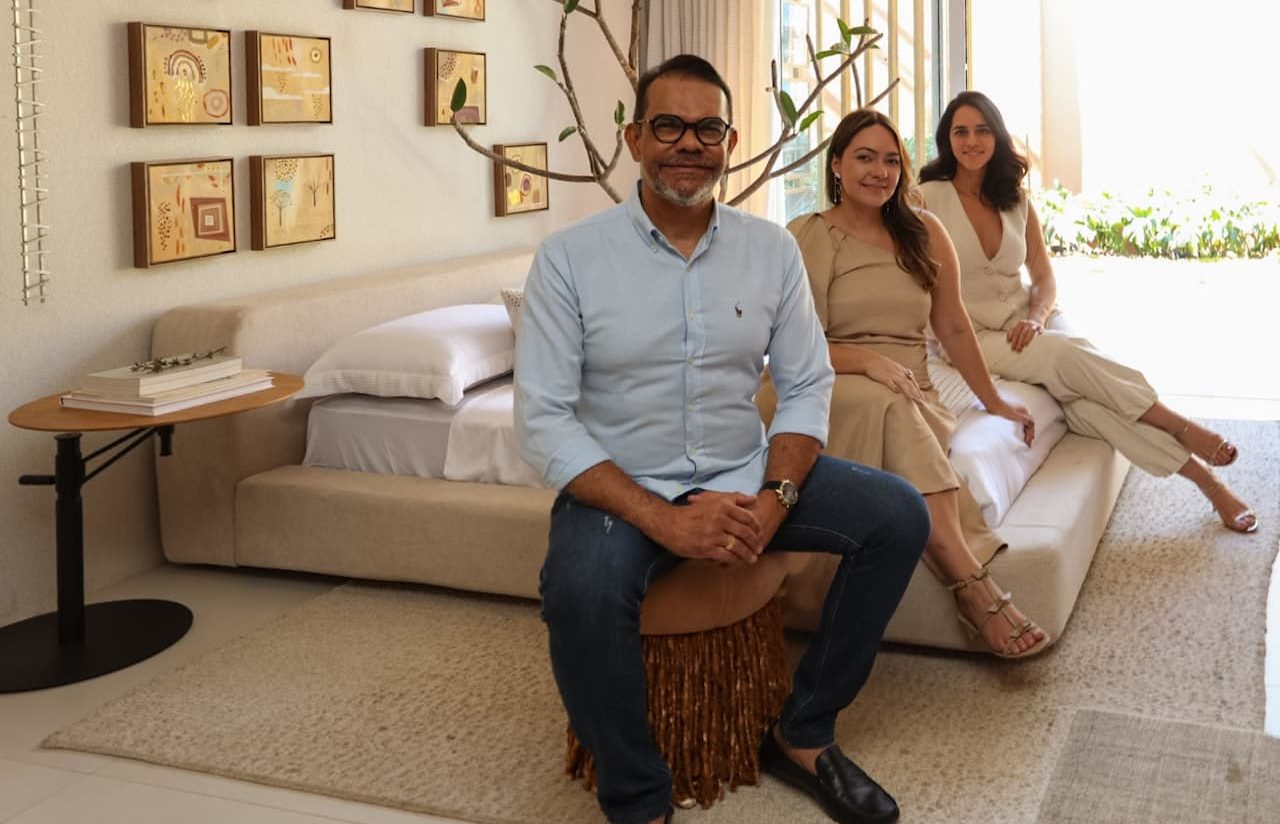 Foto: Antônio Vicente Júnior, da Simmons Park Sul, ao lado das arquitetas Ana Luiza Veloso e Amanda Saback, da Traama Arquitetura, apresentam a Casa Aava, ambiente que une design autoral e a excelência do sono hoteleiro na CASACOR Brasília 2025.. Créditos: Nova Agência.
