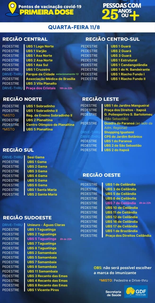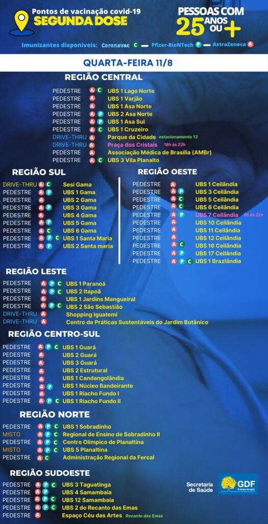 As unidades básicas de saúde iniciam a vacinação às 8h e os drive-thru às 9h. O atendimento vai até às 17h, com exceção das UBSs 7 de Ceilândia e 5 de Taguatinga, que funcionam das 8h às 22h. No período noturno também funciona o ponto na Praça dos Cristais, no Setor Militar Urbano, das 18h às 22h.