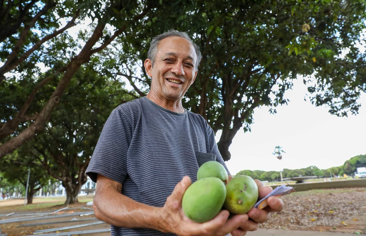 Fora do quintal de Wilto, a cena se repete em maior escala. No Eixo Monumental, em frente ao Palácio do Buriti, o comerciante Deusimar Pereira da Cruz vende pipoca no semáforo há cinco anos e acompanha de perto o vai e vem da temporada. “Todo ano, quando chega novembro, dezembro, eu tiro umas duas sacolas de manga por dia e levo pra casa, em Santo Antônio do Descoberto. O pessoal traz sacola, balde, estaciona o carro e vem derrubar as mangas com varas”, descreve.