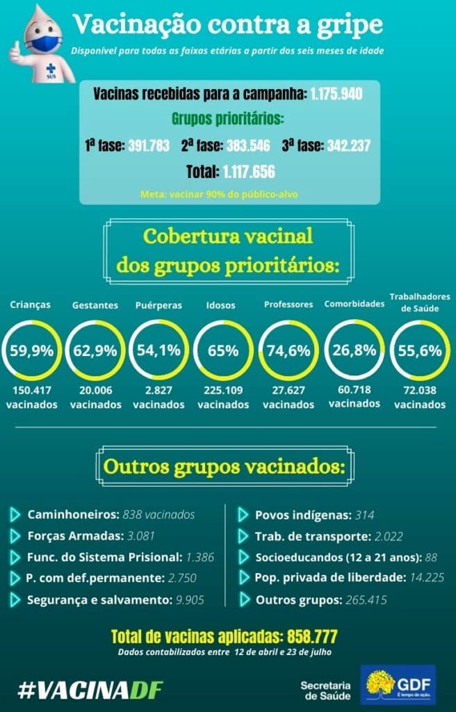 Ainda há vacinas no Distrito Federal para que a população se imunize contra o vírus influenza, que pode causar formas graves de gripe. Durante a campanha anual, a capital federal recebeu 1.175.940 doses para vacinar um grupo estimado em 1.117.656 pessoas. Em três meses, a procura pelo imunizante pelos integrantes do grupo de risco foi baixa, o que motivou o Ministério da Saúde a estender a vacinação para toda a população acima dos seis meses de idade no início deste mês.
