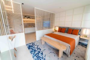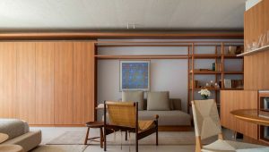 “A inspiração veio do próprio lago. Os tons de coral refletem o pôr do sol, o verde e o azul aparecem conforme a luz muda sobre a água. Usei essas cores para trazer esse clima de orla, de paz, para dentro do decorado. A madeira clara lembra a areia, os tapetes têm formas orgânicas, como se a água tivesse passado por ali. Quis criar essa sensação de acolhimento, de leveza”, explica a arquiteta.
